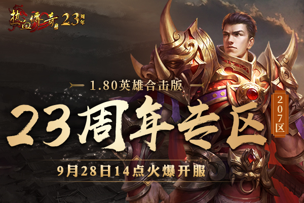 23周年专区(207区)将在9月28日火爆开服!新区将采用1.80英雄合击版:无内功、无心法、三职业的经典版本!玩新区装备官方保值新玩法,还有备受瞩目的小极品“运2项链”全新获取方式,敬请期待!