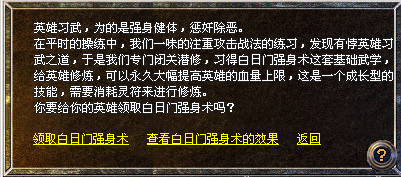 当玩家英雄等级达到55级时,前往盟重酒馆找NPC:辰星、影月和翔天,递交一瓶青稞酒和一瓶高梁酒就可领取白日门强身技能书。