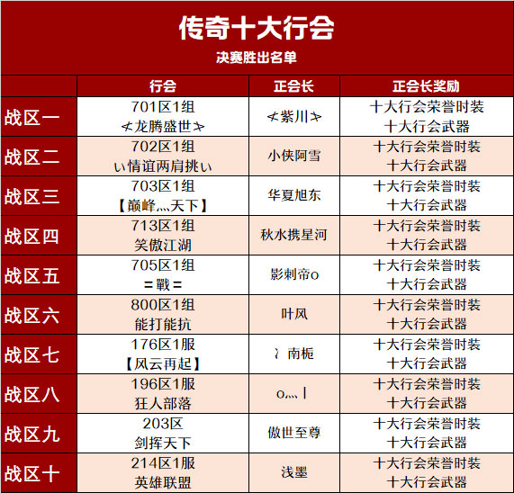 经过多轮激烈角逐,我们荣幸宣布,以下行会凭借卓越实力与默契配合,在各自战区中力压群雄,成功夺得“传奇十大行会”至高荣誉:
