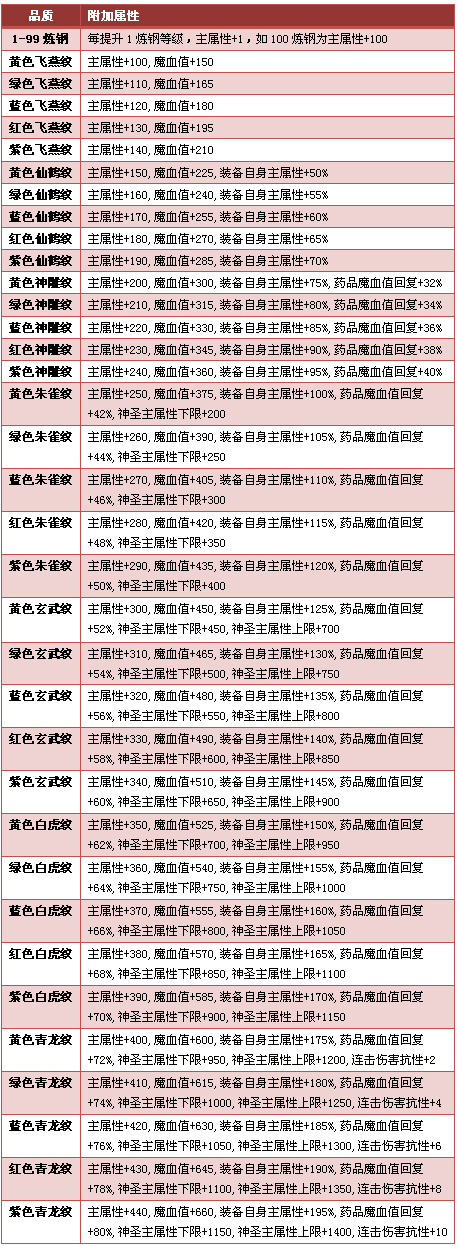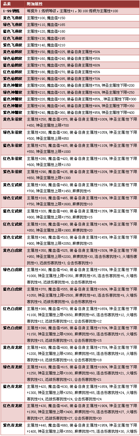 2、 在钢纹炼到飞燕纹至青龙纹时,除大幅度增加主属性外,魔血值、装备自身属性、药品魔血值回复、连击抗性等属性都可获得增加。其中使用药品回复魔血值时,会更具职业增加魔血值回复的数值。连击伤害抗性与火墙伤害抗性、合击伤害抗性、近战伤害抗性相同。