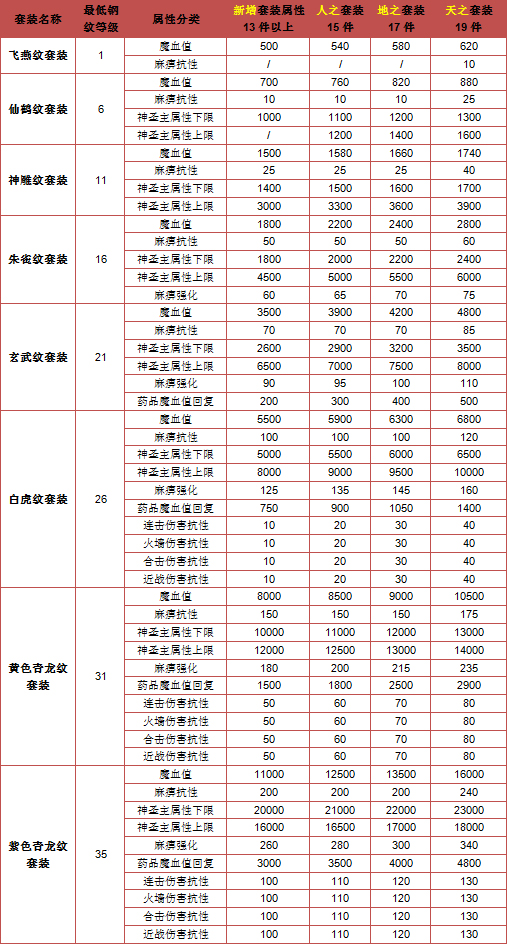 2、 在钢纹炼到飞燕纹至青龙纹时,除大幅度增加主属性外,魔血值、装备自身属性、药品魔血值回复、连击抗性等属性都可获得增加。其中使用药品回复魔血值时,会更具职业增加魔血值回复的数值。连击伤害抗性与火墙伤害抗性、合击伤害抗性、近战伤害抗性相同。