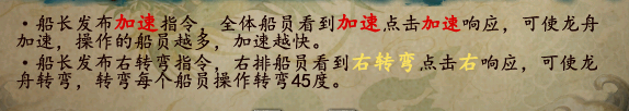 | 加速 | 船员响应成功后可给龙舟增加移动速度。 条件:船员在3秒内完成响应 结果:每个响应成功的右船员给龙舟增加3%的移动速度 最高加成:最高增加100%的移动速度 效果时间:加速前行5秒 |
