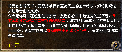 温馨提示:当全区全服的玛法主宰者数量达到现有的主宰者数量时,投票系统将自动关闭。若因主宰者数量已满导致投票系统关闭,此时若被选玩家票数超过10000票,则返还支持该玩家且投票数额达到1000票的投票者投票金额(将以元宝的形式返还)。