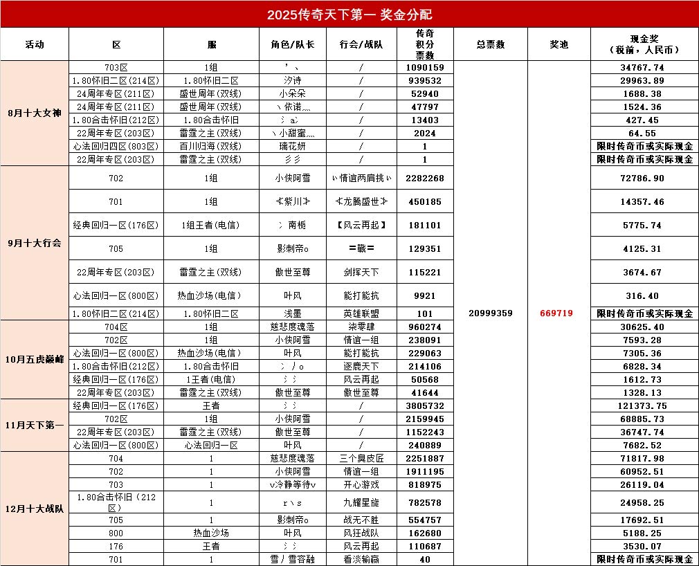 喜迎2026!感谢所有勇士一路以来的关注与陪伴,《热血传奇》2025年度第六届“传奇天下第一”全部赛事圆满收官!最终总奖金池已定格,大家期待的奖池分配方案,今日正式揭晓!