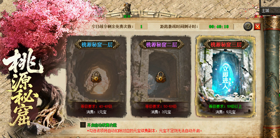 (1)可在“桃源秘境”副本选择面板中勾选“开启自动续费”功能,时间结束时自动扣费续时,可随时手动取消。