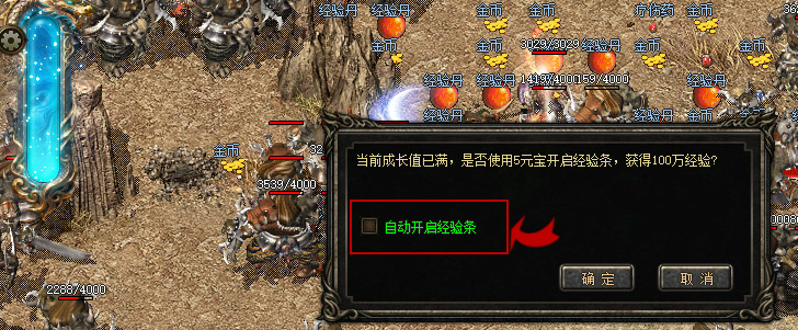 击败怪物可累积“经验条”(显示在主界面左侧),集满后可花费5元宝激活经验条,立即获得100万经验(也可选择不激活)。