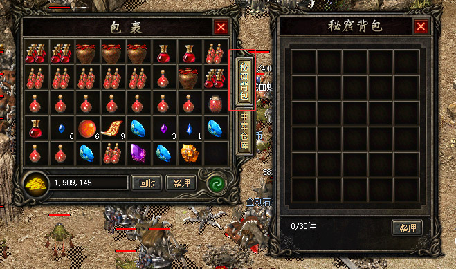 在PVP激战时间段内,秘窟内获得的所有道具(除疗伤药、强效疗伤药),包括击败其他玩家获得的装备,会暂存于独立的“秘窟背包”中。在PVE时间段内,获得道具拾取后进入角色包裹。