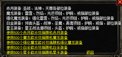 击败地图内怪物有概率掉落 经验丹、金刚石券、小极品宝石、赤月/魔龙/强化魔龙/白金/星王碎片。碎片可合成对应类别的随机装备。