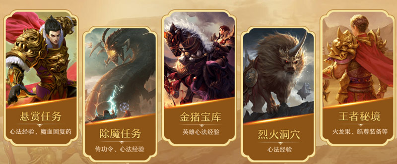 悬赏任务、除魔任务、金猪宝库、烈火洞穴、王者秘境!