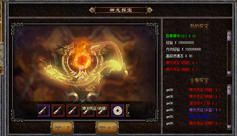 神龙有宝,等你来探!5传奇币即可参加神龙探宝,神龙会把它珍藏已久的珍贵宝藏送给你!获得特定好礼的勇士,神龙将会使用神力告知玛法大陆的所有人。神龙不会时常降临,一定要把握住机会!